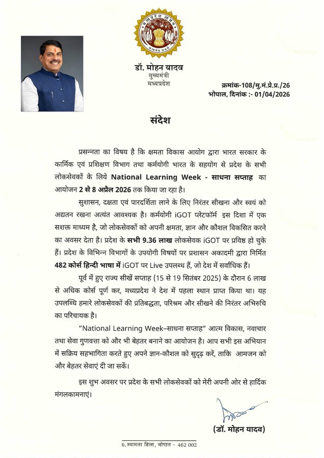 Thu, 2 Apr 2026Dr. Mohan Yadav, Chief Minister, Madhya Pradesh calls for active participation in – Sādhana Saptah.
